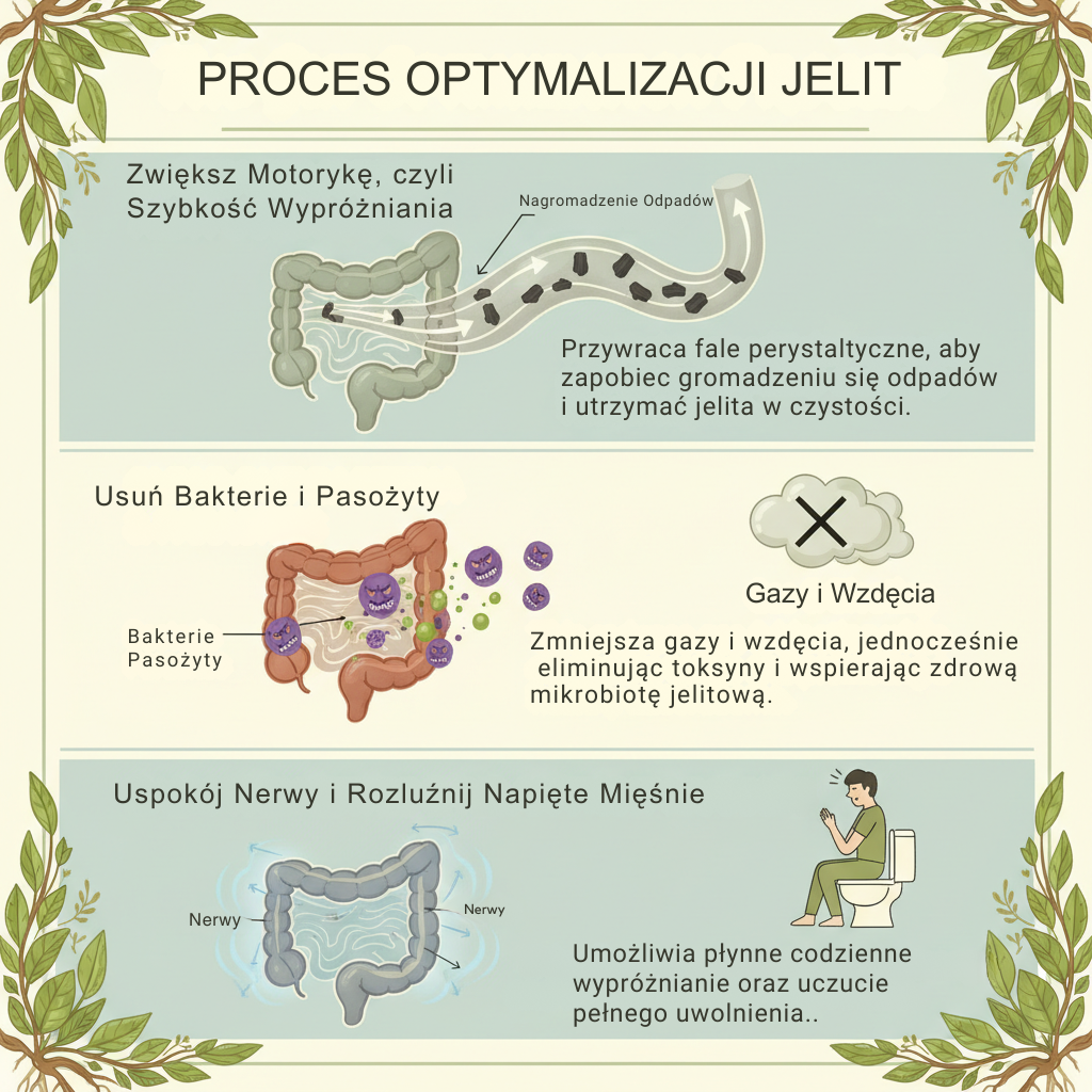 Pomaga przywracać fale perystaltyczne, aby zapobiec zaleganiu resztek i utrzymać jelita w czystości.